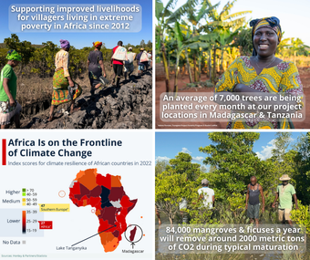 Our Climate Positive program will create 2 weeks of work and fair income for villagers living in extreme poverty to plant 600 trees at our Recruit & Restore project sites in Africa. This volume of planting will remove around 14 metric tons of CO₂ during typical maturation, which is greater than the amount that will be emitted by the average US resident in 2026.